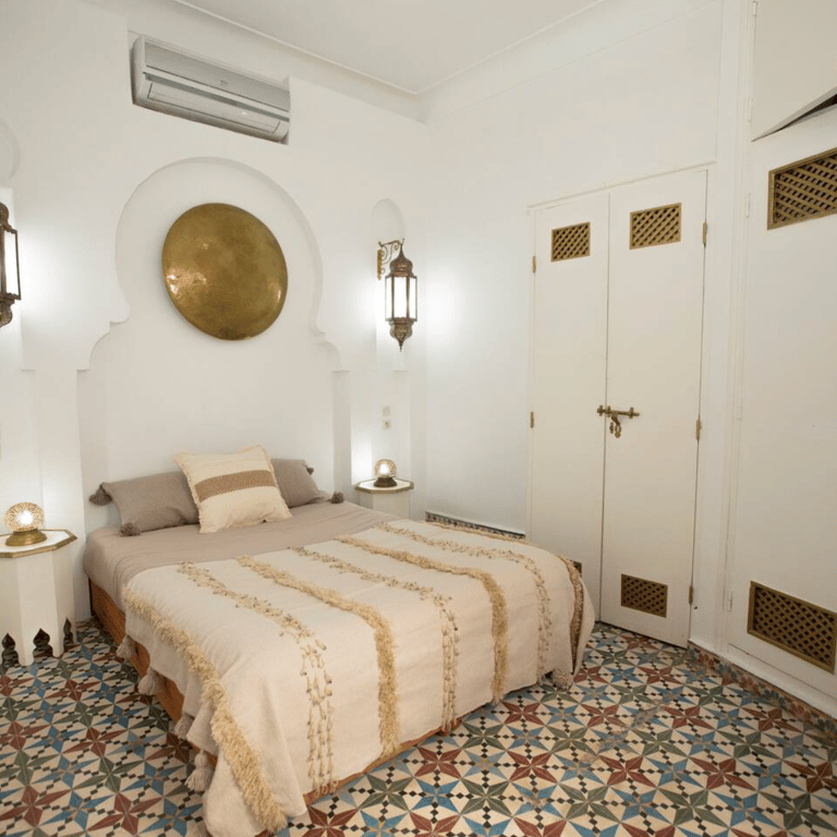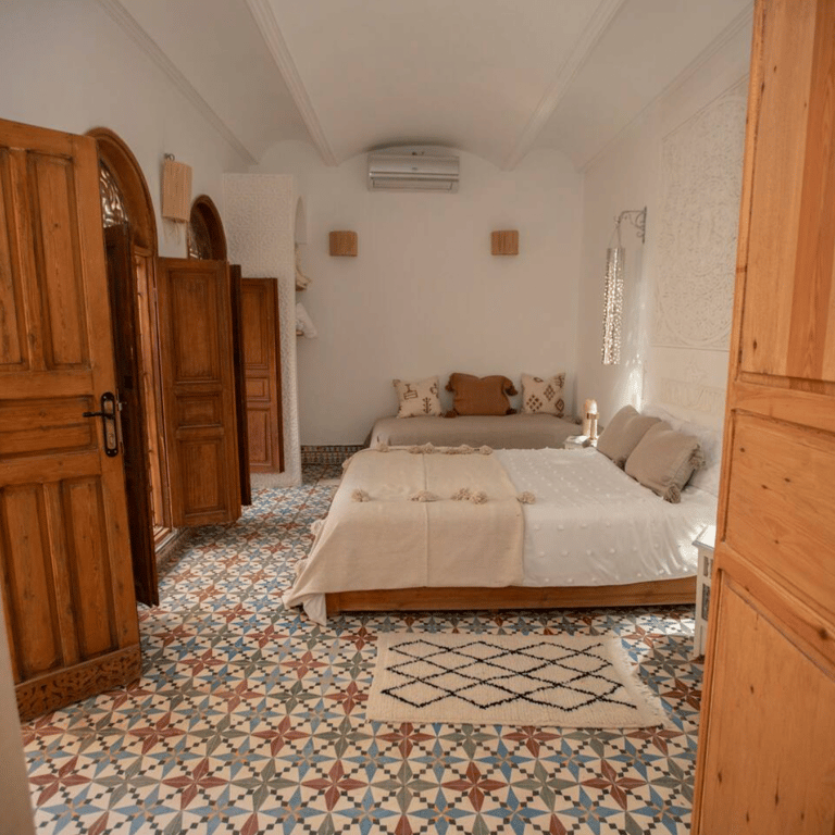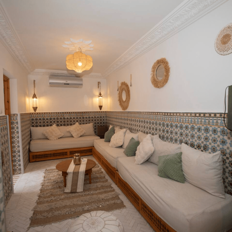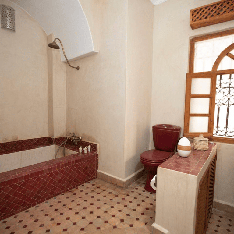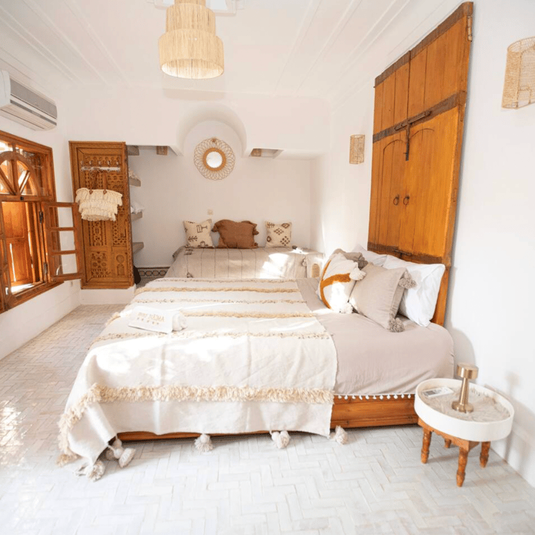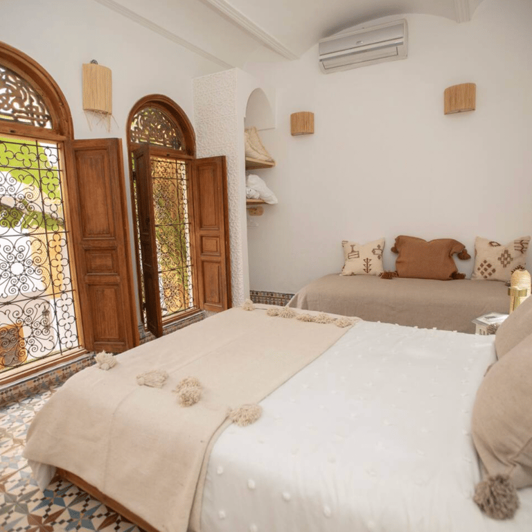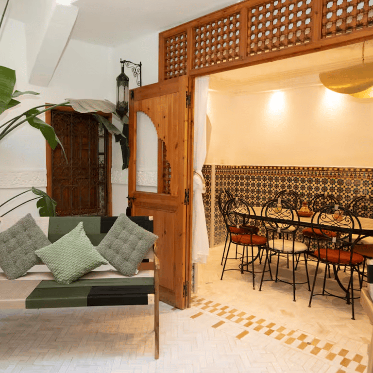 This elegant riad features three beautifully designed bedrooms, accommodating up to eight guests. It includes two spacious suites with en-suite bathrooms and a third bedroom with its own shower room.The sun-drenched patio, complete with a refreshing plunge pool, leads to a spacious living area and a fully equipped kitchen.The highlight? A stunning rooftop terrace offering panoramic views of the Atlas Mountains and the Koutoubia Mosque.