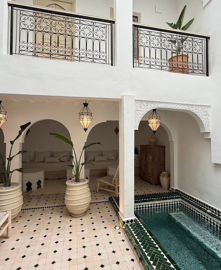 This bright riad blends Moroccan elegance with contemporary minimalism, centered around a serene patio and a green-zellige plunge pool. An intimate, refined space designed for calm and relaxation.